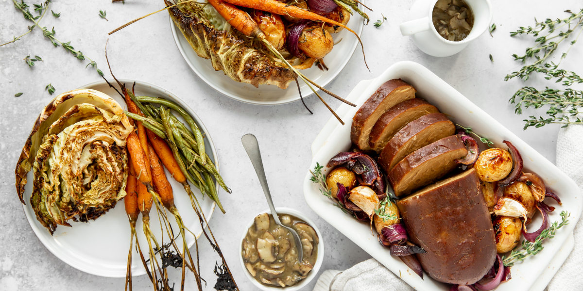 So müssen Veganer heutzutage noch nicht einmal auf den klassischen Weihnachtsbraten verzichten: Unser Veganer Festtagsbraten aus Seitan ist faserig, saftig, lecker – einfach genauso, wie ein Braten sein soll. Als Ganzes im Ofen zubereitet oder in Scheiben geschnitten und in einer Sauce erwärmt, wird er zum Star eines jeden Festessens. Ob ganz klassisch zubereitet oder modern interpretiert – das schmeckt der ganzen Familie!