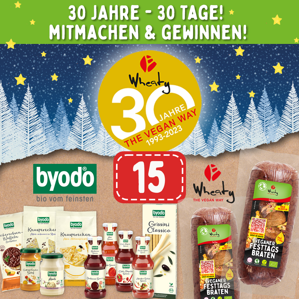 Probiert mit etwas Glück selbst: Täglich verlosen wir Pakete mit unseren bio-veganen Fleisch- und Wurstalternativen und an ausgewählten Tagen Produktpakete und Gutscheine befreundeter Unternehmen, für die Bio-Lebensmittel und Nachhaltigkeit genauso wichtig sind wie für uns!