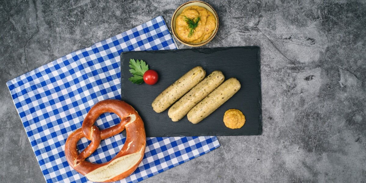 Der Legende nach wurde die Weißwurst 1857 im Gasthaus „Zum Ewigen Licht“ am Münchner Marienplatz erfunden – und zwar eher zufällig, als „Fehlfabrikat“ bei der Bratwurstherstellung. In Wahrheit dürfte es früher gewesen sein; so ist inzwischen ein alter Stich aus dem Jahr 1814 aufgetaucht, der Münchner Biertrinker eindeutig schon beim Weißwurst-Zuzeln zeigt. Wie dem auch sei: Das Verdienst der Erfindung der veganen Weißwurst jedenfalls kommt uns zu – mit unseren Weißen haben wir das Traditionswürstchen mit dem obligaten Muskat-Zitronen-Petersilie-Geschmack zeitgemäß aktualisiert.