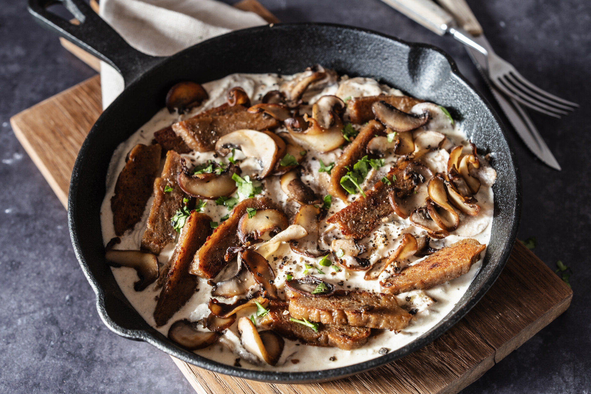 - Öl in einer großen Pfanne erhitzen und darin Zwiebel und Knoblauch glasig anbraten. Champignons dazugeben und kräftig anrösten, bis sie leicht gebräunt sind. Mit Mehl oder Stärke bestäuben, kurz anschwitzen und dann mit Gemüsebrühe und pflanzlicher Sahne ablöschen.