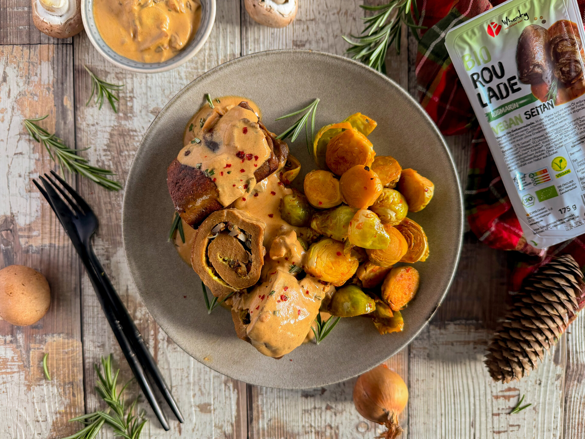 - Für die Sauce gewürfelte Zwiebel und in Scheiben geschnittene Champignons einige Minuten in Öl anbraten. Paprikapulver, Misopaste, Senf, Hefeflocken und Kokosblütensirup dazugeben, kurz mitrösten. Mit Weißwein ablöschen, einkochen lassen, mit Gemüsebrühe aufgießen. Rosmarin kleinschneiden und zusammen mit der Sojasahne hinzugeben, weitere 5 Minuten köcheln lassen. Mit Salz und Pfeffer abschmecken. Dann die Rouladen in die Sauce geben und darin ziehen lassen.