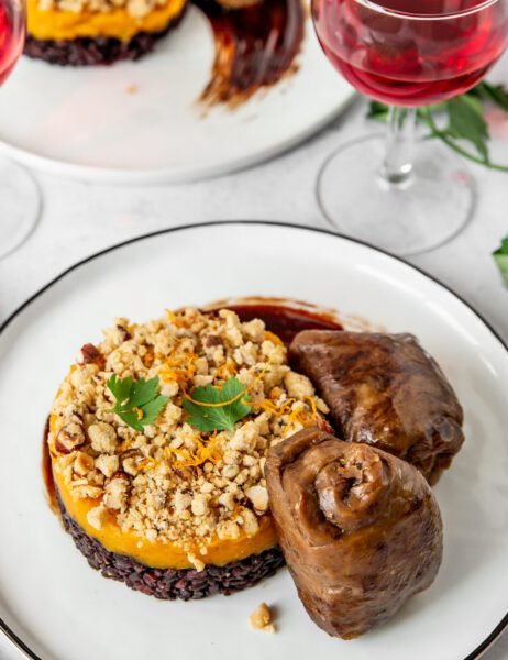 - Zum Servieren einen Löffel Balsamico-Karamell auf einen Teller geben und mit einem Pinsel mit einer schnellen Bewegung verteilen. Einen Servierring in die Mitte des Tellers legen. Etwas schwarzen Reis hineingeben und mit einem Löffel nach unten drücken, um eine gleichmäßige Schicht zu erhalten. Dann eine Schicht Kürbispüree, zum Schluss die Streusel darauf geben. Auf die Streusel etwas frisch gezupfte Petersilie geben. Den Servierring vorsichtig entfernen. Zusammen mit den Rosmarin-Rouladen servieren.