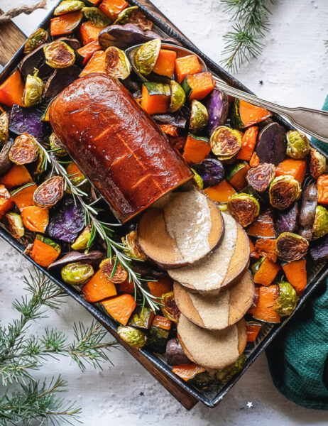 Unser Festtagsbraten auf Basis von Bio-Seitan lässt festliche Stimmung aufkommen und schmeckt auch Fleischessern. Für ein festliches Mahl, das alle Sinne verwöhnt, haben wir hier das perfekte Rezept für einen veganen Weihnachtsbraten mit köstlichem Ofengemüse. Unser Veganer Festtagsbraten wird knusprig gebraten und mit einem Hauch von Rosmarin aromatisiert. Dazu servieren wir saftige Ofenkartoffeln, süßen Kürbis, aromatischen Rosenkohl und eine verführerische Pilzsauce, die das Gericht vollendet. 🎃🍄